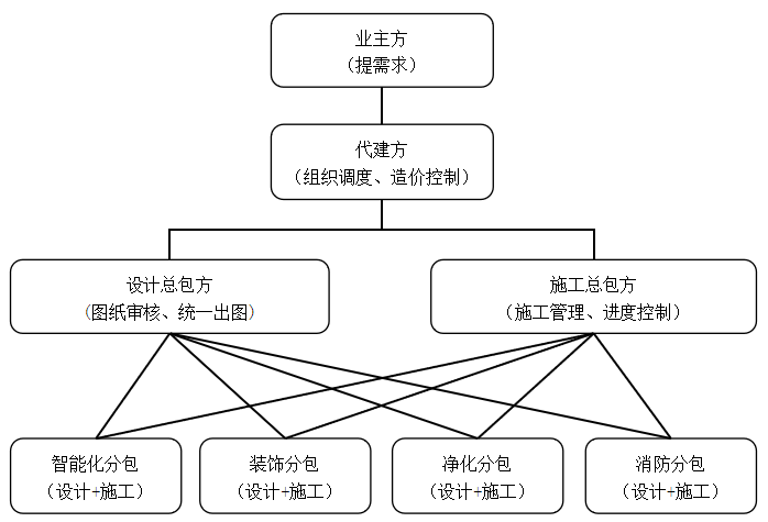 本项目中真正实施设计施工一体化的单位是各分包单位,分包单位分智能化分包、装饰分包、净化分包及消防分包,每个分包单位均直接对设计总包和施工总包进行负责。每个分包单位承担边设计边施工的职责,设计的过程图纸和最终成果由设计总包方进行审核及出图;施工质量、进度、造价由施工总包进行监督和把控。