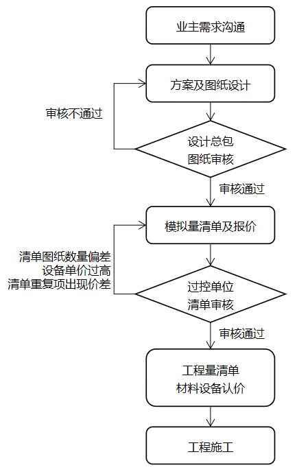 (1)业主需求沟通:在EPC项目进行初期,设计需要跟使用单位进行充分沟通,对需求进行确认,对方案及图纸进行及时确认,此过程需注意任何确认一定要书面化,以此作为图审的重要依据;(2)方案及图纸设计:方案及图纸设计是边沟通边设计边确认的,在总体方案及图纸完成后,由设计总包单位进行审核确认并出图,此过程中设计总包单位审核的依据是业主的需求确认单;(3)模拟量清单及报价:在图纸确认后,需要编制详细清单及报价,此过程一定注意清单项的名称要与图纸的设备名一一对应,清单中出现的任何项目都要在图纸上找到出处,以减少下一步过控的审核难度和时间;(4)过控审核:一是审核清单量是否与图纸对应,二是审核单价是否存在偏离市场价格较多的情况,此过程中一定存在过控单位对图纸和清单存在疑问的地方,所以为保障时间进度,需配置专门的设计人员和清单编制人员对图纸和清单进行解释说明;(5)清单认价:过控初审审核通过,财评二次审核,最终业主确认清单及价格;以上是EPC项目的常规流程,但具体的实施过程远比以上要复杂得多,所以还是要具体项目具体对待,最终目的还是要保障进度和质量,保证项目顺利实施。