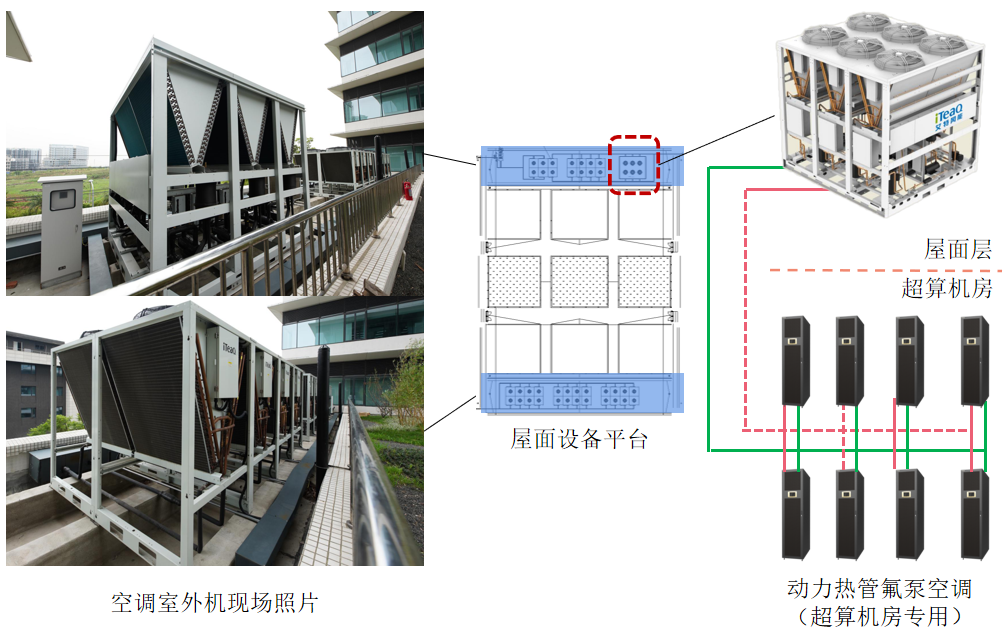 (1)超算区:这个项目比较特别的是除了普通的5KW/机柜的服务器区,还有10KW和15KW/机柜的超算区,放置的都是高密度的超级计算机。而超算区的设计在供电方式、冷热通道宽度、空调选型上均存在较大差异,方案经过多轮论证才最后敲定。(2)空调的选型:因空调外机位置和面积的制约,空调选型存在很大困难,无法采用PUE值更低的冷冻水空调,只能采用风冷空调。经多番现场考察测量,以及与净化专业的协调,最终敲定了空调外机放置区域。在此区域限制下,我们对普通的服务器区采用了集中冷凝的风冷空调,对超算区域采用了一拖多的动力热管氟泵空调。