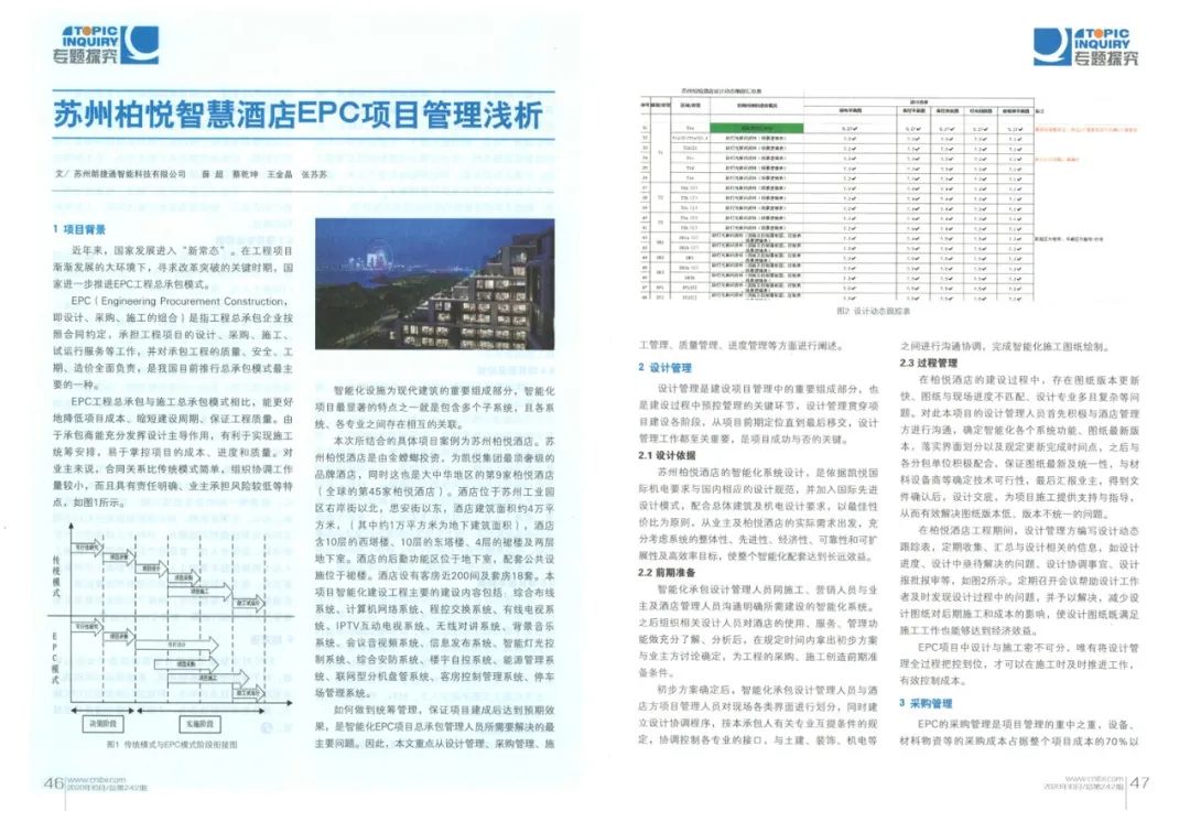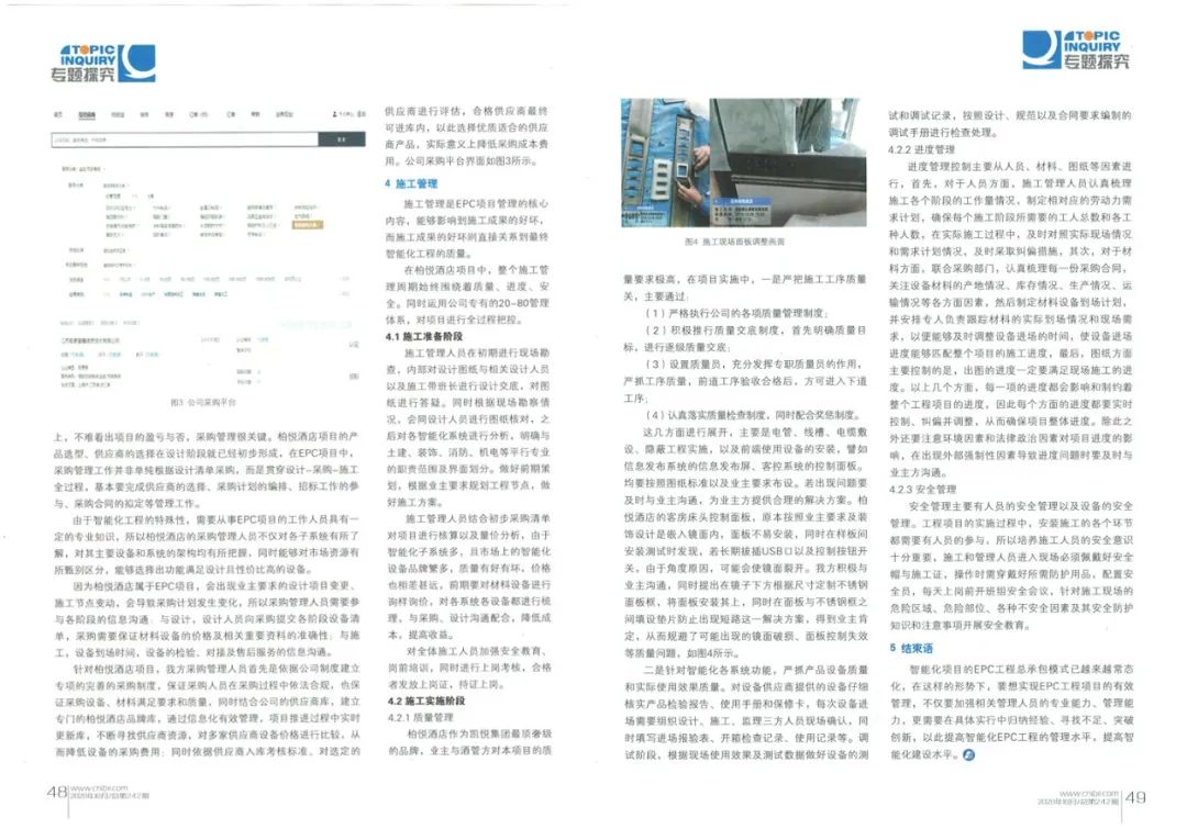 二是针对智能化各系统功能,严抓产品设备质量,实际使用效果质量。对设备供应商提供的设备要仔细核实产品检验报告、使用手册和保修卡,每次设备进场需要组织设计、施工、监理三方人员现场确认,同时填写进场报验表、开箱检查记录、使用记录等。调试阶段,根据现场使用效果及测试数据做好设备的测试和调试记录,按照设计、规范以及合同要求所编制的调试册进行检查处理。柏悦酒店项目进度管理控制,主要从人员、材料、图纸等主要因素进行管理控制,首先,对于人员方面,施工管理人员认真梳理施工各个阶段的工作量情况,制定相对应的劳动力需求计划,确保每个施工阶段所需要的工人总数和各工种人数可以确保到位,在实际施工过程中,也要及时对照实际现场情况和需求计划情况,及时采取纠偏措施,其次对于材料方面,联合采购部门,认真梳理每一份采购合同,关注设备材料的产地情况,库存情况、生产情况、运输情况等各方面因素,然后制定材料设备到场计划,并安排专人负责跟踪材料的实际到场情况和现场需求,以便能够及时调整设备进场的时间,以便能使设备进场进度能够匹配整个项目的施工进度,最后,图纸方面主要控制的是,出图的进度一定要满足现场施工的进度。安全管理主要有人员的安全管理以及设备的安全管理。工程项目的实施过程中,安装施工的各个环节都需要有人员的参与,所以培养施工人员的安全意识十分重要,施工和管理人员进入现场必须佩戴好安全帽与施工证,操作时需穿戴好所需防护用品,配置安全员,每天上岗前需开班组安全会议;一些安全风险事故的发生与设备、材料的不当管理有莫大关系。智能化工程也避免不了与电打交道,在现场临时施工用电时必须按照规范要求,使用用电设备,同时必须使用检验合格的安装材料设备。智能化项目的EPC工程总承包模式已越来越常态化,在这样的形式下,要想实现EPC工程项目的有效管理,不仅要加强相关管理人员的专业能力、管理能力,更需要在具体实行中归纳经验、寻找不足、突破创新,以此提高智能化EPC工程的管理水平,提高智能化建设水平。
