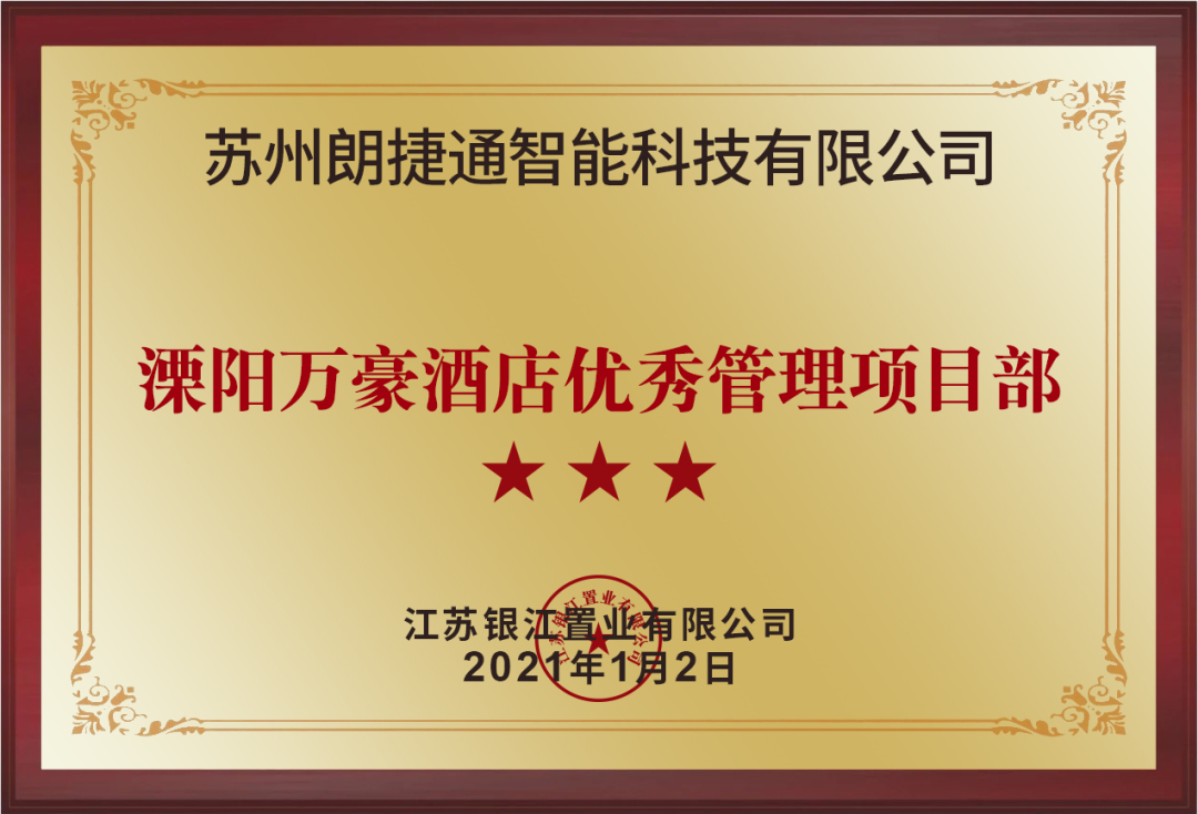 万众瞩目,豪情起航 2021年1月2日,溧阳万豪酒店震撼揭幕,完美落成。朗捷通总经理林海、五分公司总经理王凤奎受邀出席落成答谢宴会,共同见证朗捷通智慧酒店领域又一重磅力作的惊艳亮相。落成仪式上,朗捷通凭借出色的施工表现和“以客户为中心”的奋斗精神被授予“优秀管理项目部”的称号。