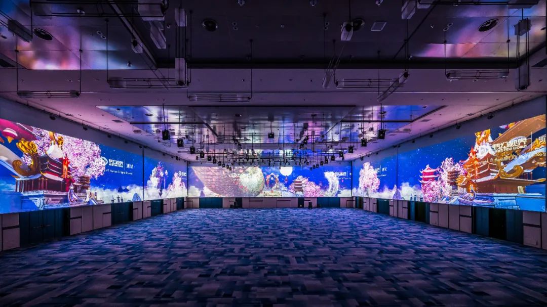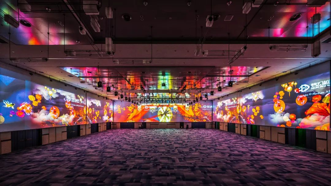宴会厅中近400平米的环幕投影,通过多台投影机及边缘融合技术,带给宾客极致的沉浸感体验。它以特殊的投射方式大大加强了影像的层次感,全新的视觉体验让人流连忘返。