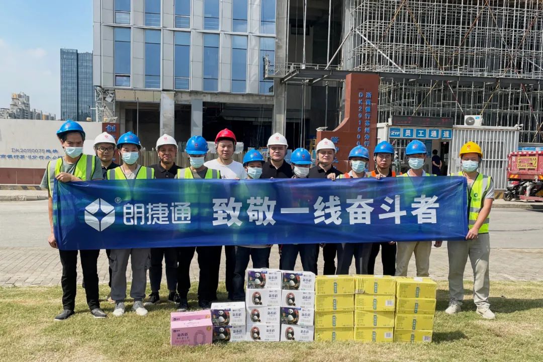 浙商银行苏州分行项目 在浙商银行苏州分行项目现场,朗捷通董事长翁志勇、总裁林海、副总经理刘亚峰、副总经理兼工会主席姜永新、五分公司总经理王凤奎对坚守在施工一线的工人们表示了衷心的感谢,并强调项目部要在常态化抓好疫情防控工作的同时切实把后勤保障工作落到实处;要加强安全意识教育,充分落实好各项安全生产措施;要结合项目建设实际,调动广大职工的积极性、主动性和创造性,保证工程项目顺利推进。